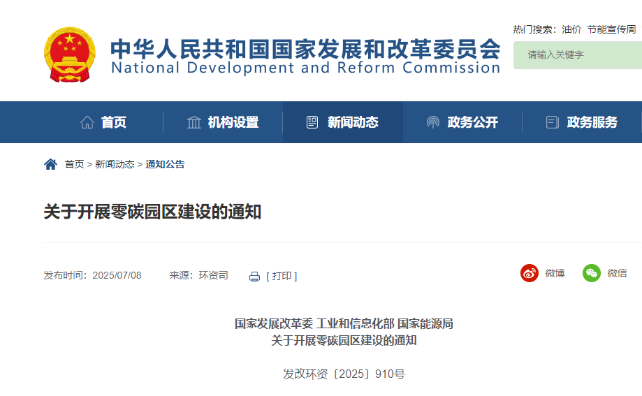 國家發(fā)展改革委 工業(yè)和信息化部 國家能源局印發(fā)《關(guān)于開展零碳園區(qū)建設(shè)的通知》 2025-07-08